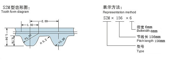 三個部分:指示帶的長度,間距和寬度帶回來的部分號碼。如下圖所示。此S2M橡膠單麵齒同步帶型號,節線長為156mm,帶寬6mm。