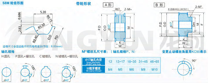 | 規格 | 形狀 | 節徑P.D | 外徑O.D | 擋邊外徑F | 擋邊內徑M | 輪轂直徑Dm | 內孔dH7 | |||||